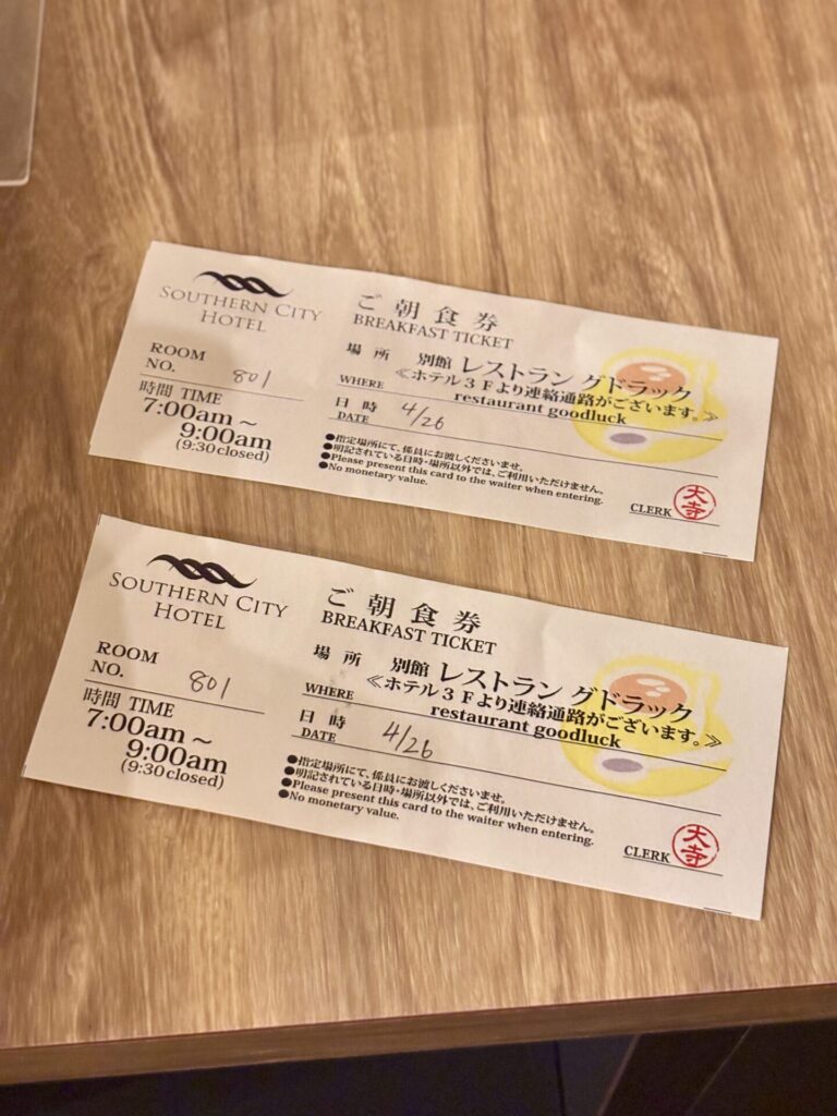 こちらの朝食券をレストランに持参するのをお忘れなく!(忘れると隣の建物まで取りに戻らないといけません。)